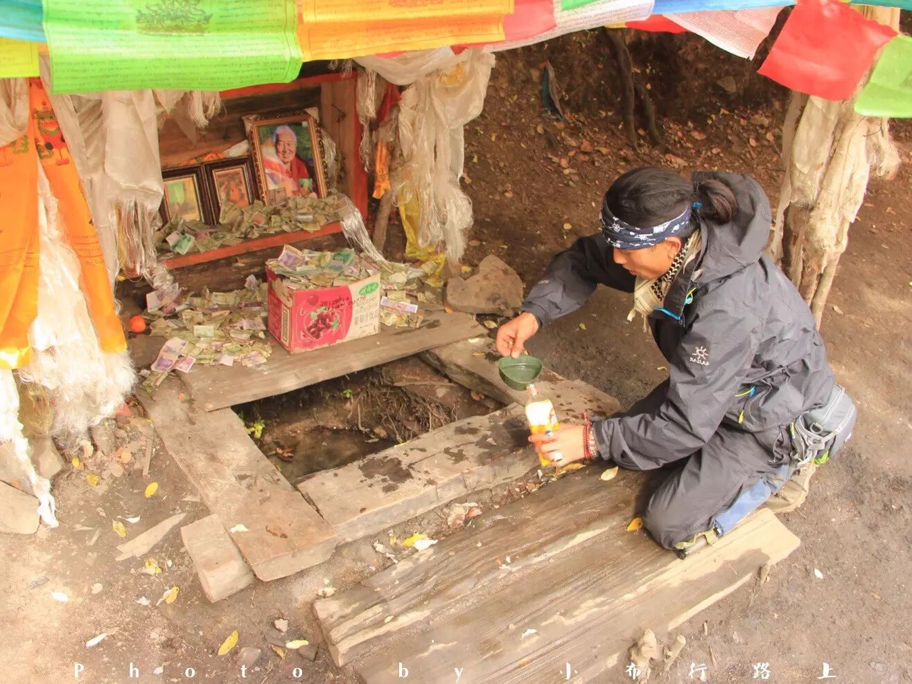 据说,那是当年噶玛巴活佛转山途经此处,这个山头是唯一一个转山途中没有水源的地方,看转山的人虔诚而辛苦,再次盘坐发下宏愿,隔天地方就冒出了清澈的泉水。
