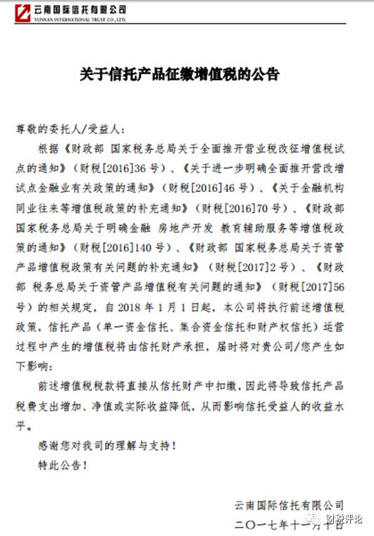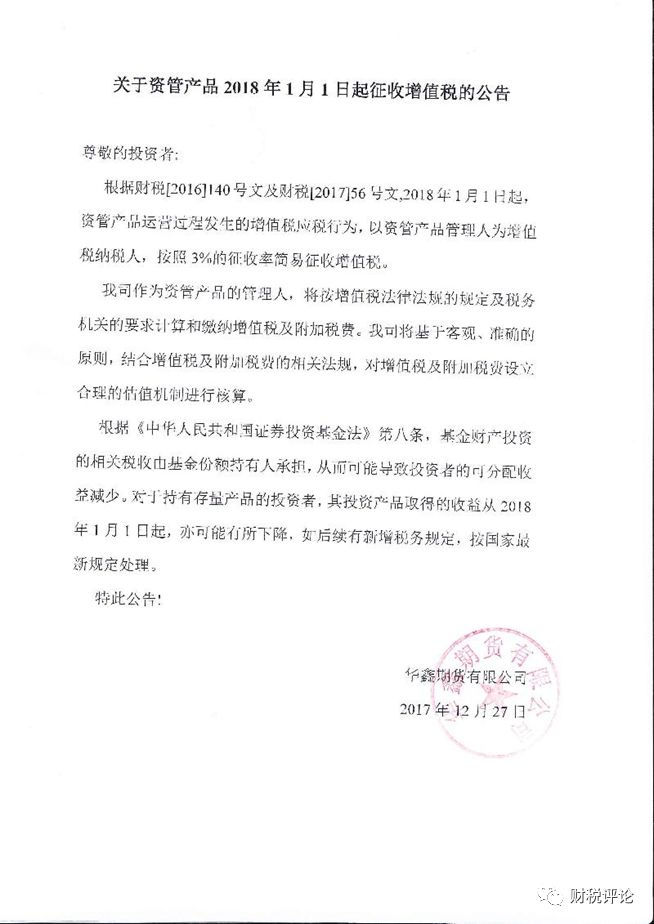 关于资管产品2018年1月1日启征增值税及附加税费的公告