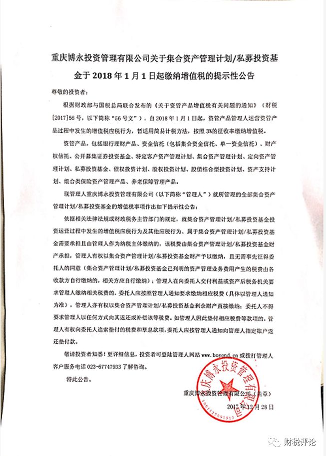 现我司(以下简称“管理人”)就所管理的全部资产管理计划的增值税事项作出如下提示性公告: