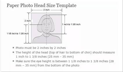 ●照片尺寸:2×2英寸(50 x51毫米)头部必须占到从头部顶部到颈部比例的1 -1又3/8英寸之间(25-35毫米)