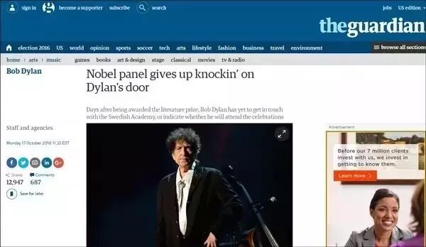 虽然迪伦拒领诺奖被证实是假新闻。但诺贝尔奖官方——瑞典皇家学院也证实:从宣布获奖那天起,他们就一直没有联系上迪伦本人。