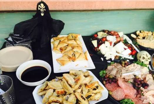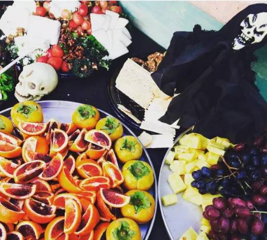 ▲ 血橙和柿子拼盘,菠萝葡萄水果拼盘 , 少不了骷髅人