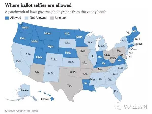 上周,美联社(The Associated Press)广泛查阅了所有50各州有关选票自拍的系列法规,结果发现其中有18个州禁止分享选票照片。在科罗拉多和纽约州,公开自己的选票依然是一项轻罪。另外,加利福尼亚州也在周三加入了这个名单,因为一名联邦法院法官否决了一项允许选票自拍的要求。