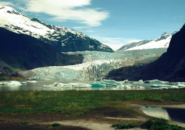 相比冰川湾国家公园,门登霍尔冰川是一个更为便捷的选择。它离朱诺市区仅半小时车程,可乘坐大巴或自行开车前往。这里还有一个长达12英里的门登霍尔冰洞,在阳光的反射下,呈现出蓝色的洞壁。绚烂而奇幻,彷佛一个异世的冰下世界。