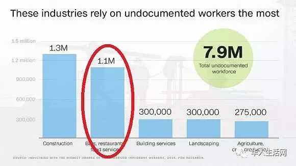 据美国劳工统计局公布的最新数据,2015年有710万的美国餐饮从业者为移民,本土从业者为510万。另据皮尤公布的数据,2014年约有110万餐饮从业者为无证移民。在美国,餐饮业对无证移民的依赖程度仅次于建筑业。