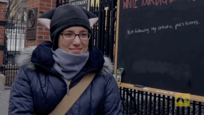 带着猫耳帽的她在黑板面前犹豫一下,然后写下:自己最大的遗憾就是,没有去坚持当初对艺术的热情。