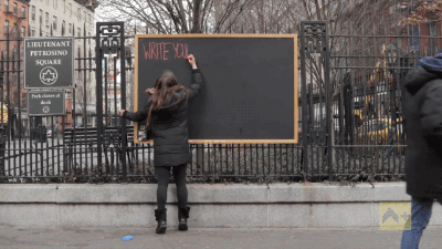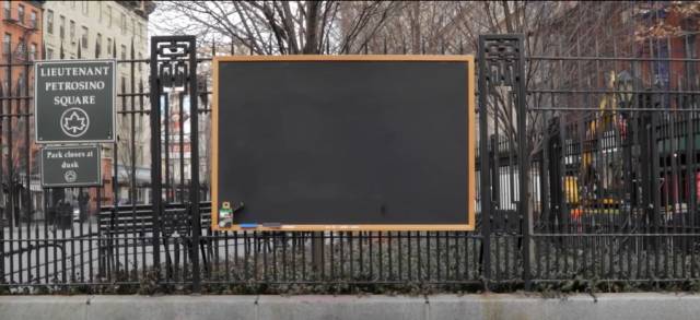 纽约街头的人行色匆匆,看到这块黑板,却都停下了脚步。有人驻足,咬嘴唇歪头静静思考,有人拿相机拍照PO到网上。