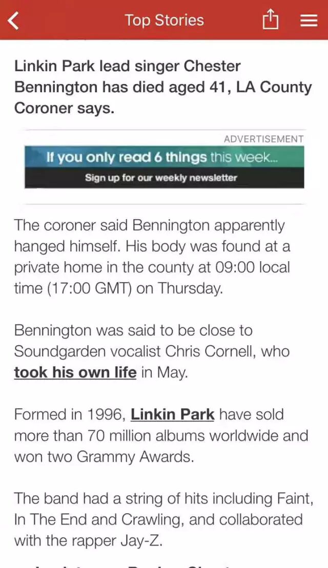 据外电报道,当地警方指出,查斯特·贝宁顿被人发现在民宅中上吊轻生,而有过两段婚姻的他,留下6名子女,生前也曾有药物及酒精成瘾的问题。过去查斯特·贝宁顿也透露,幼时曾遭成年男子性侵,让他一直有轻生念头。