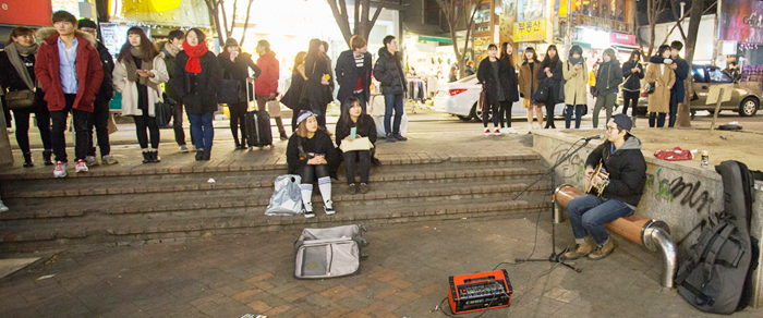 如果你逛累了哪儿都不想去,那就随意在弘大的街头走走吧,也会有意外的惊喜。这儿经常会有一些音乐爱好者,带上自己的乐器,在街头找一块地方,旁若无人地就开唱。他们的水准大多不错,经常会引得里三层外三层的路人停下来倾听。如果你不着急,不妨停下脚步来静静聆听,或许会给你的旅途添上值得回忆的一笔。