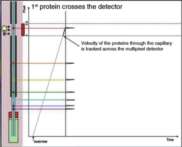 HPCE512以每秒10到15次的速度对512像素光电二极管阵列上的每个分析物带进行成像,因此,每个分子带(在这个例子中是蛋白质)的传输在时间和距离上可以被追踪。