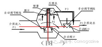 区, P2 区作用在膜片下方。手动阀口节流后的压力为P3 区(介质流出),P3