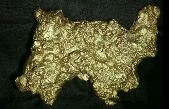 1909年,四川省盐源县一位采金工人在井下作业时不幸被顶上掉下来“石块”砸伤了脚,他搬开“石头”感到很重,搬到坑口一看,竟是一块狗头金,重达31kg。