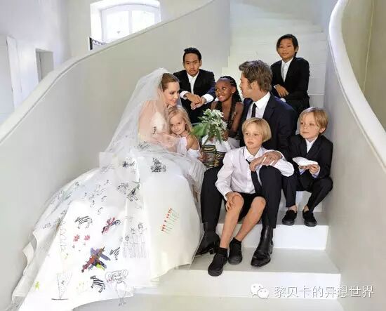 安吉丽娜·朱莉和皮特结婚的时候,两人都儿女成群了。朱莉选择的是经典的大摆裙,但她的裙摆上布满了小朋友们的涂鸦,立刻打破了庄重的气氛,非常有爱。↓↓↓
