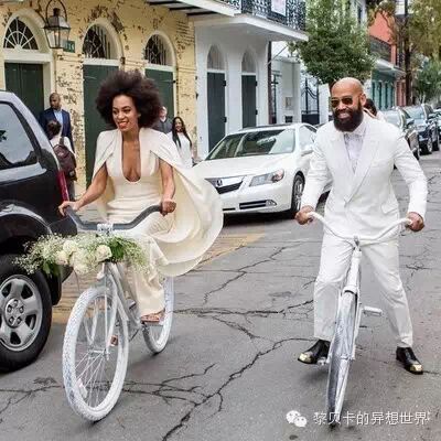 Knowles和妹夫婚礼当天骑着自行车去了教堂,够酷吧。↓↓↓
