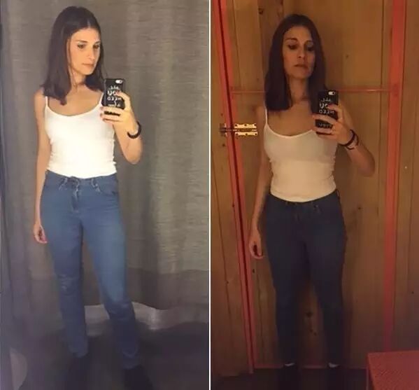 对比一下就知道了,更衣室的灯光和镜子,才是真正的光影魔术手,根本就是判若两人,小蛮腰说有就有了~▼