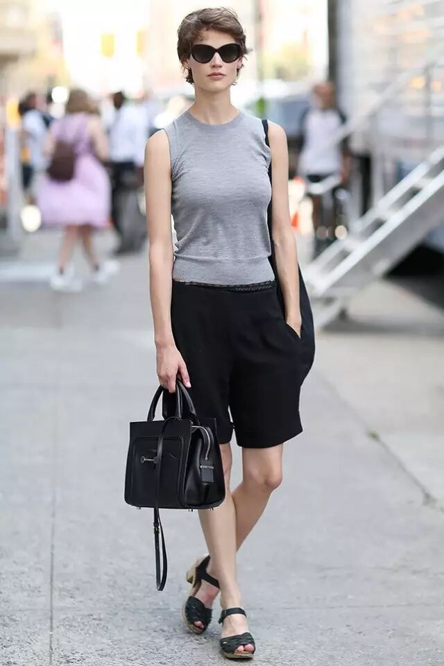 不过,说句实话,流行归流行,爸爸同款短裤还是蛮显腿短的。即使拥有超模的大长腿,也会淹没在里面。▼