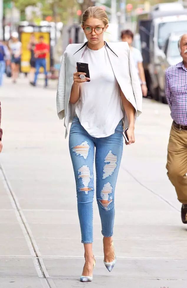 白色紧身破洞牛仔裤会更特别一点,视觉上更清爽,很适合夏天穿。Gigi这条来自J Brand。