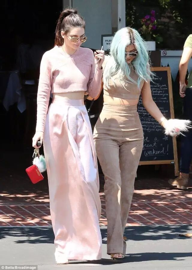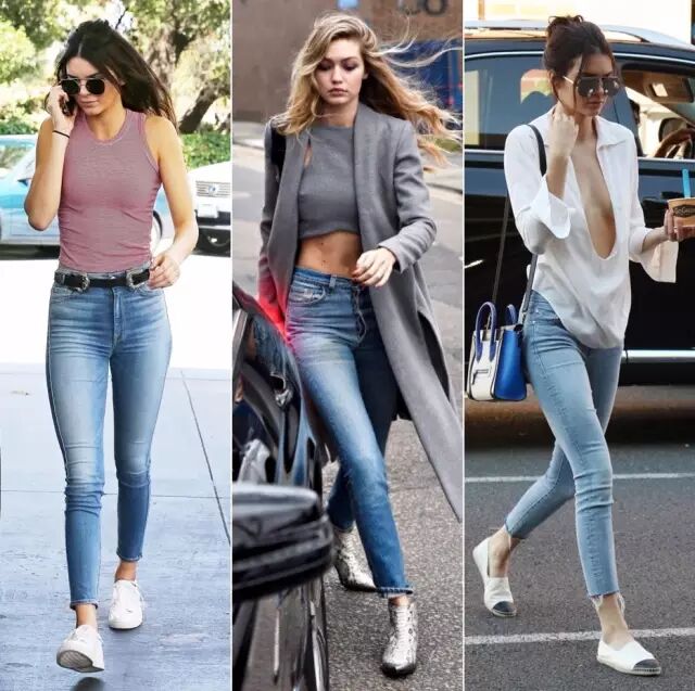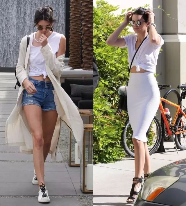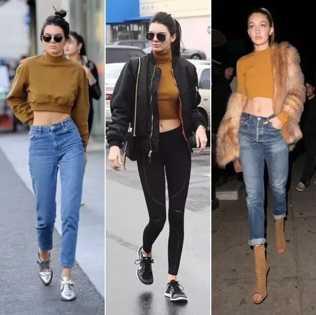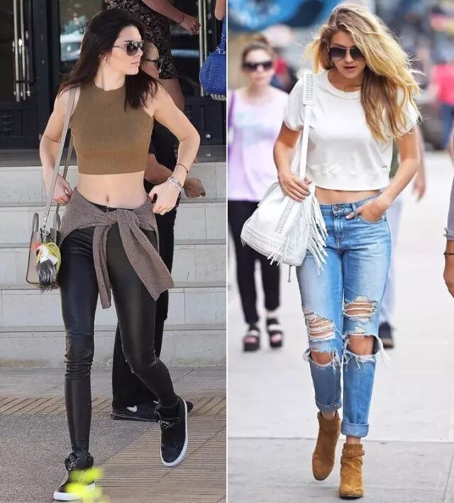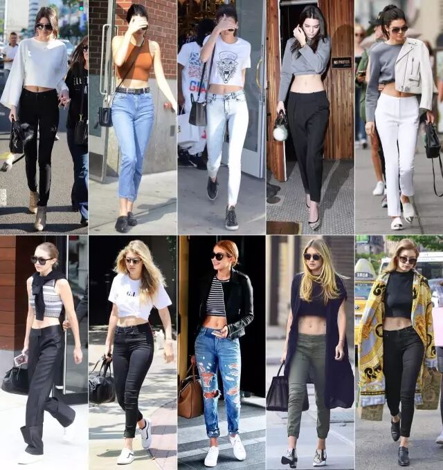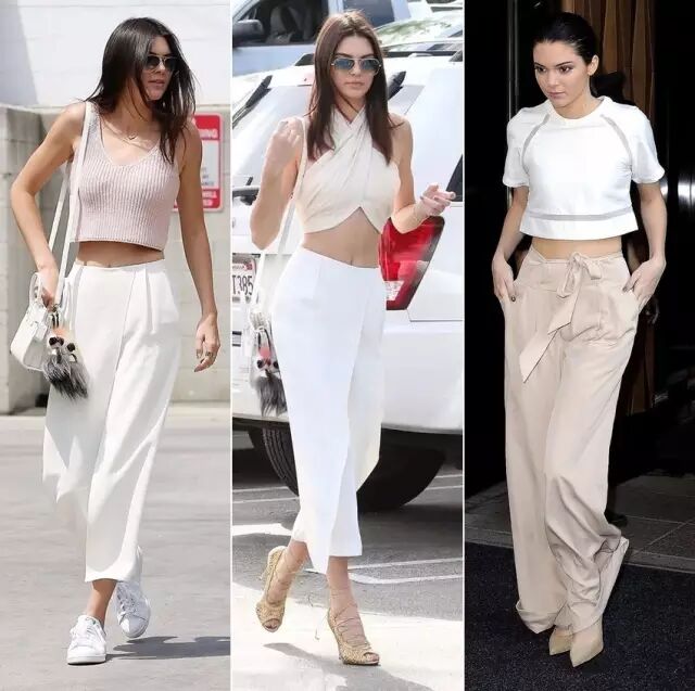 露胃装也算是百搭单品,从上面的图可以发现,网红们最爱搭牛仔裤穿。夏天来了,想穿出清爽感,不妨学学Kendall搭配颜色清浅的阔腿裤。▼
