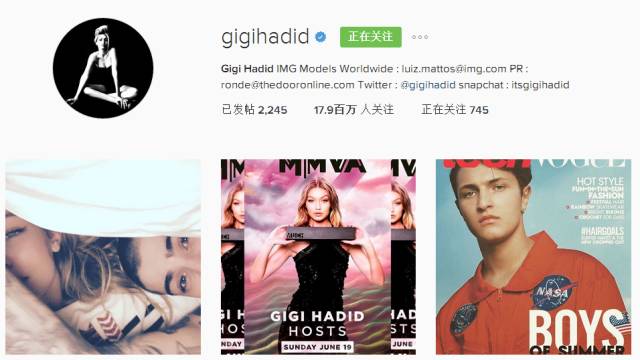 Gigi现在ins粉丝有17,900,000,随便发张照片就可以获得1百万的点赞。▼