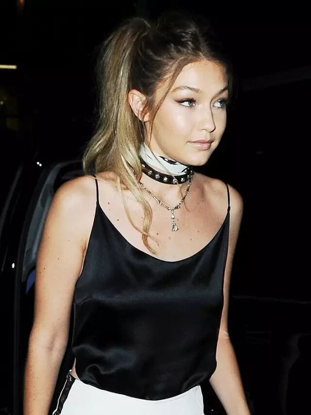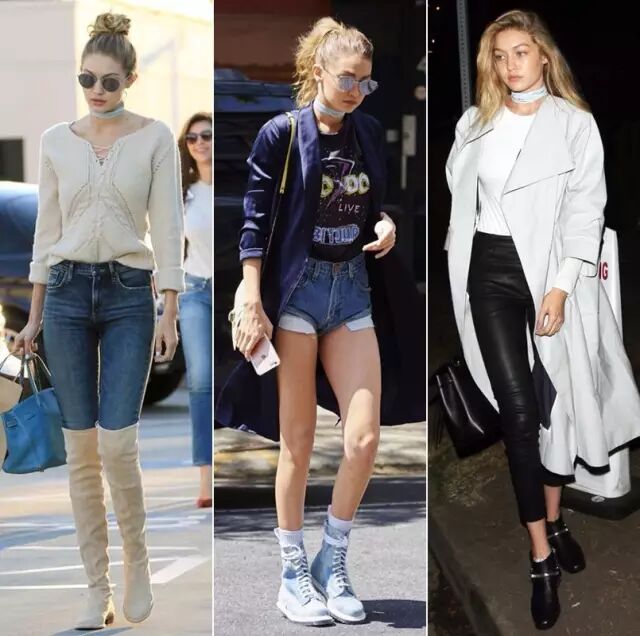 Gigi超爱戴这条浅蓝色的,在一众黑色皮质choker中显得很特别。▼