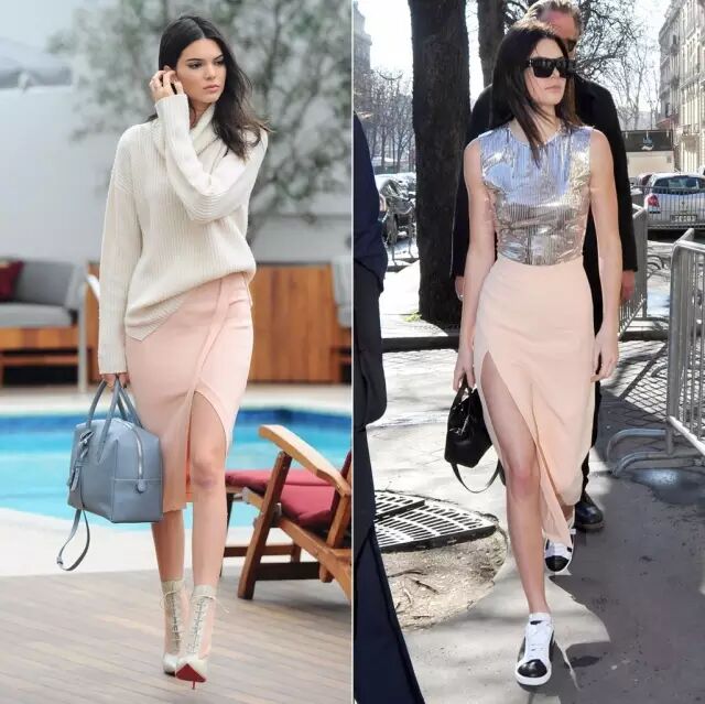 开叉裙也可以搭配气质硬朗一点的单品,同样是裸粉色的开叉裙,穿高跟鞋和运动鞋完全是两种不同的feel。▼