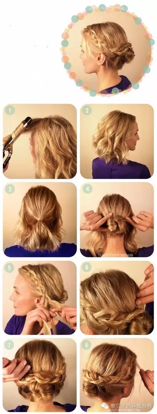 把后面部分的头发扎成一个丸子,然后从额头两侧开始往后编辫子,直到把发际线一圈的头发都编进去,最后两个辫子在脖子后面交汇。把这部分发尾固定在一开始扎好的丸子上。Done!▼