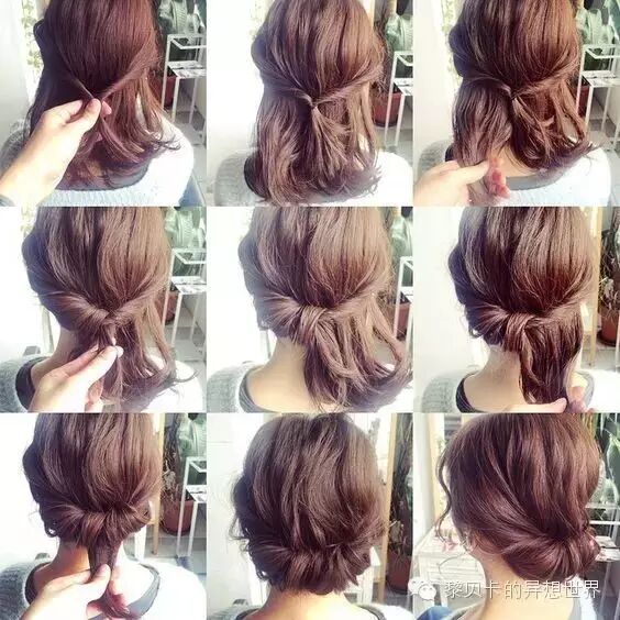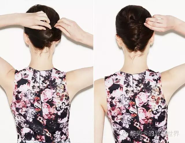 稍微长一点的lob头,可以在半盘发的基础上,尝试下面这种低发髻(Low Updo),也很简单,直接把剩余的头发塞进上面的半盘发,固定好。▼