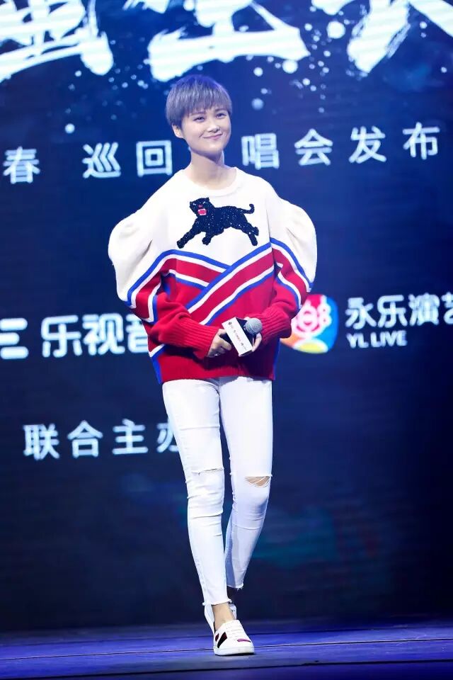6月21日,“野蛮生长”巡回演唱会发布会,李宇春穿Gucci 2016秋冬系列的红白水手领长袖针织衫亮相,搭配Gucci Ace系列球鞋,清爽俏皮,笑容甜美~▼
