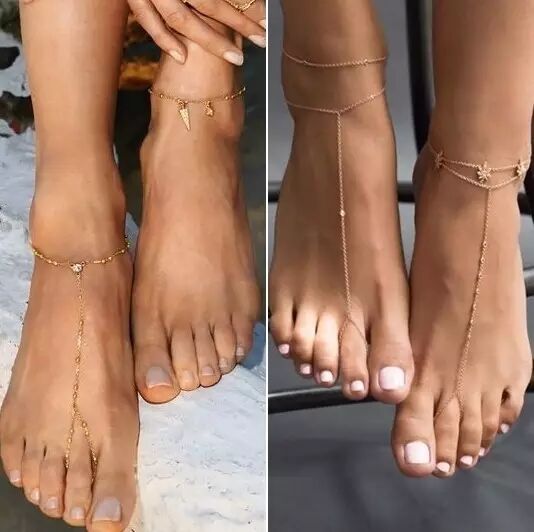 除了比较普通的脚链,还有这种Y字形连着脚趾的细长链,更有女人味。不过就想问问,脚是什么感受~▼