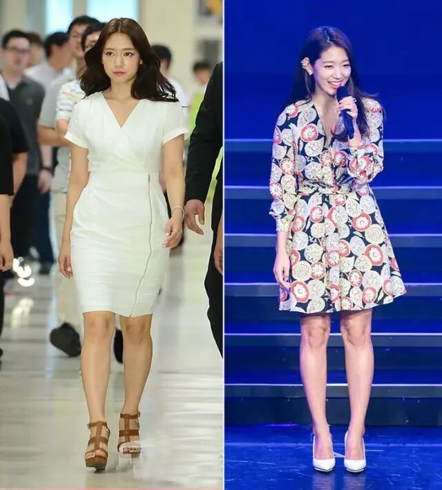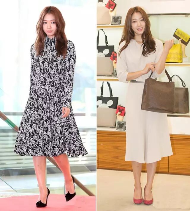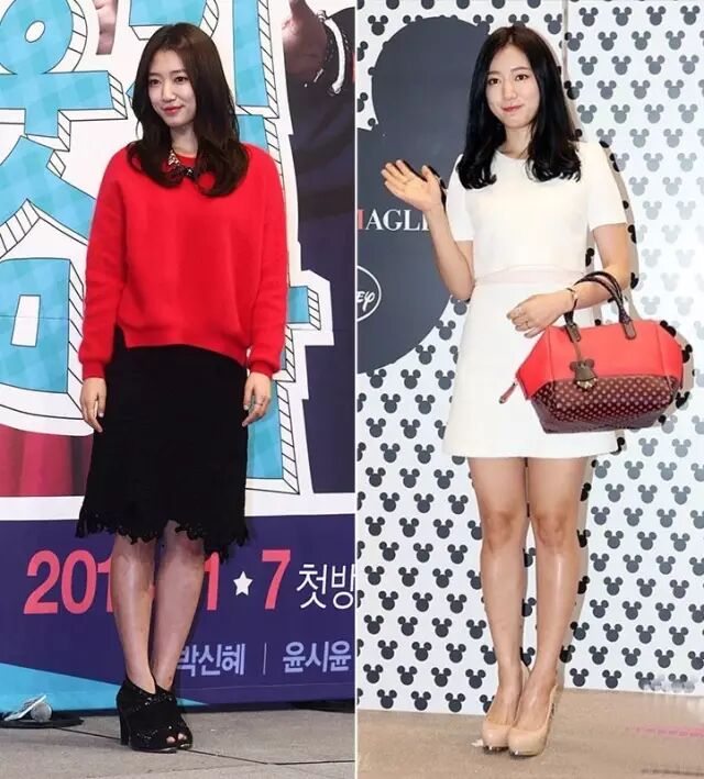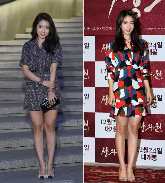 瘦下来之前的朴信惠腿整体很壮,露出大腿和膝盖反而比半遮半掩更显瘦。对比一下▼