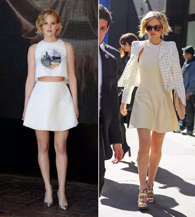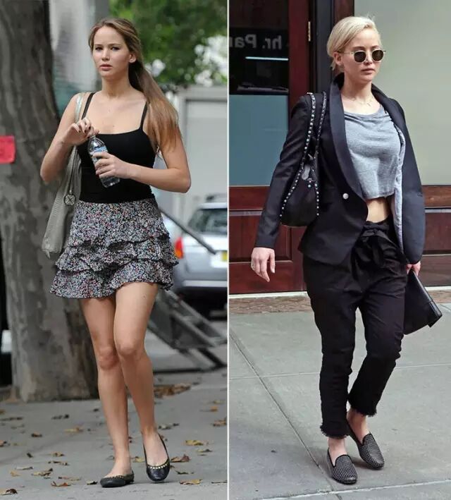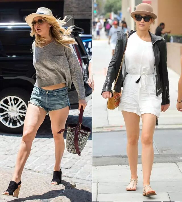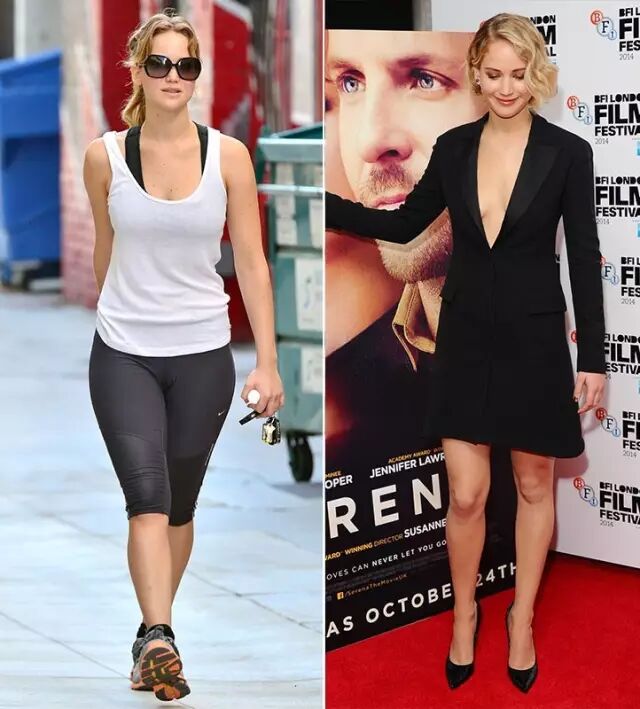 歪果仁中也有不少梨型身材,比如大表姐詹妮弗·劳伦斯,对比一下她穿紧身裤和裙子,藏肉效果是不是很惊人~▼