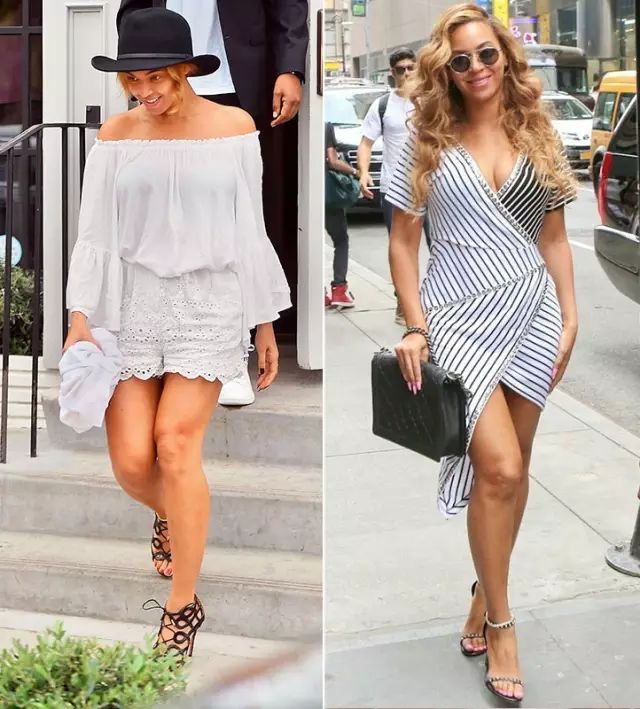 聪明的做法是选择肩部有装饰或者一字领、V领的上衣,把视线转移到肩部,可以让肩膀看上去接近胯部的宽度,打造X型身材。Beyonce的示范▼