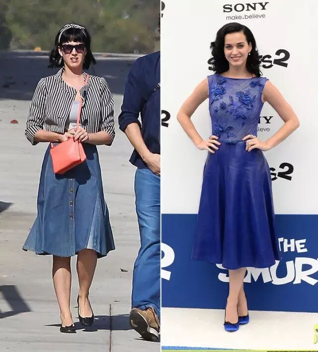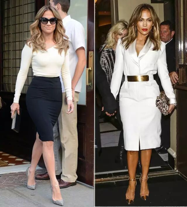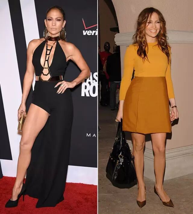 裙长当然不能太短,比如下面这种迷你短裙,同样是自曝其短。长度在膝盖上下的裙子最合适。Jennifer Lopez这两身,差距不是一般的大~▼