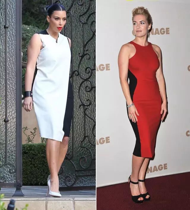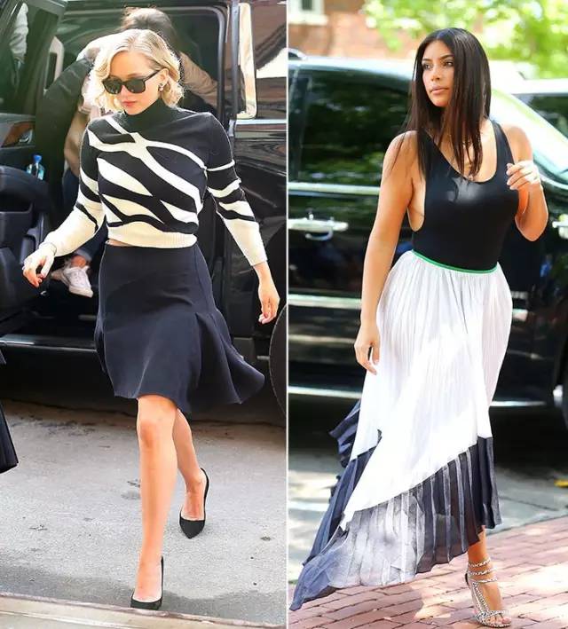 同样道理,浅色的上装 深色的下装也有调整梨型身材比例的效果。对比一下,大表姐穿的小黑裙材质合身、显瘦,卡戴珊这件轻飘飘的白色百褶裙则让她的下半身看起来膨胀无比。▼