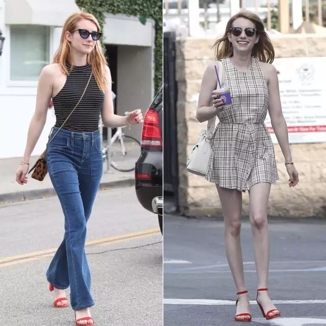 红色一片式就更美艳了,还很显脚白。Emma Roberts经常穿的这双一片式凉鞋是Stuart
