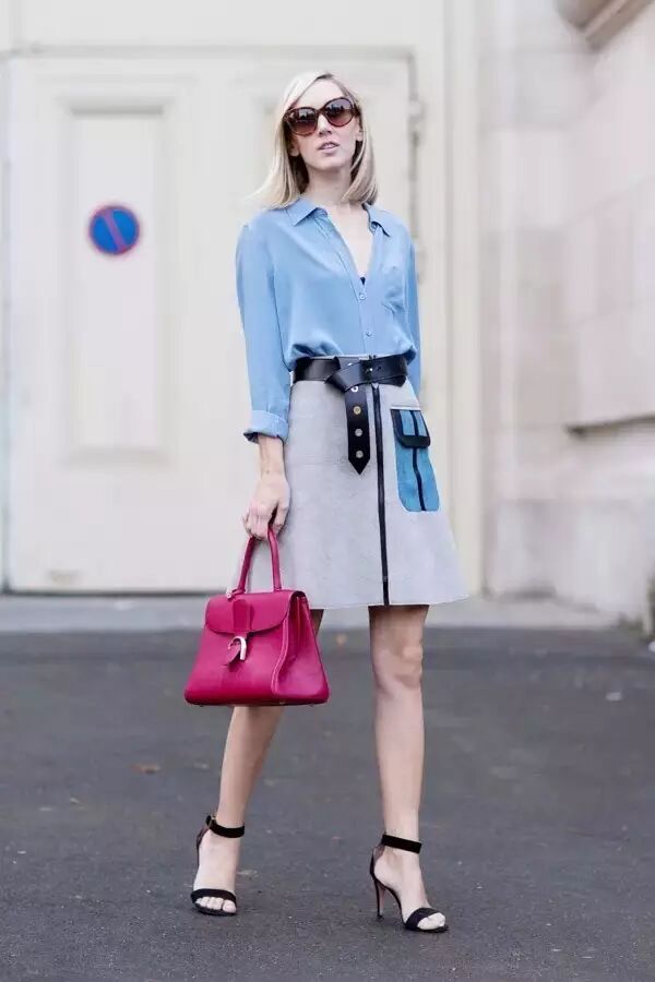 蓝色衬衫很多人都有,日常中可能都是搭配紧身牛仔裤或黑色铅笔裤来穿,虽然不出错,但也不出彩,撞衫几率当然高。▼