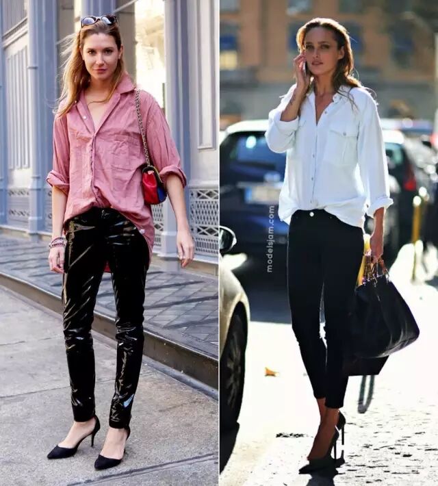 丝质的衬衫,则更优雅、成熟一点,也有点小性感。但如果是身上有点肉肉的话,丝质衬衫则有点显胖,挺括的面料会显得更精神,其他衣服也同理。▼