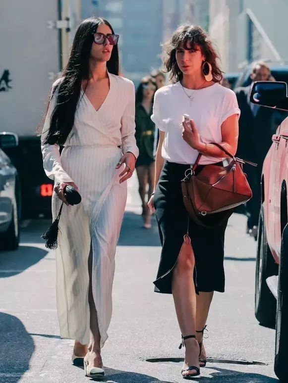 下面两位时装精也是个好例子。左边穿的裹身裙更特别一点,右边这位穿的是更基础款的白T恤,所以右边这位就在配饰上更用力,让整体不平淡。▼
