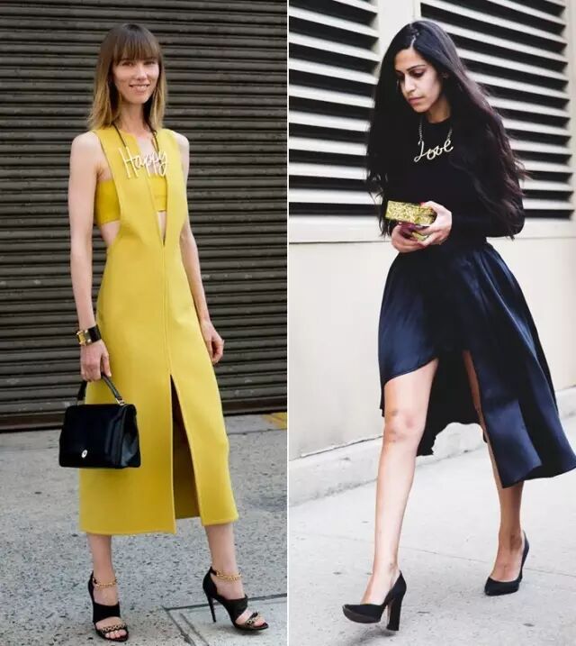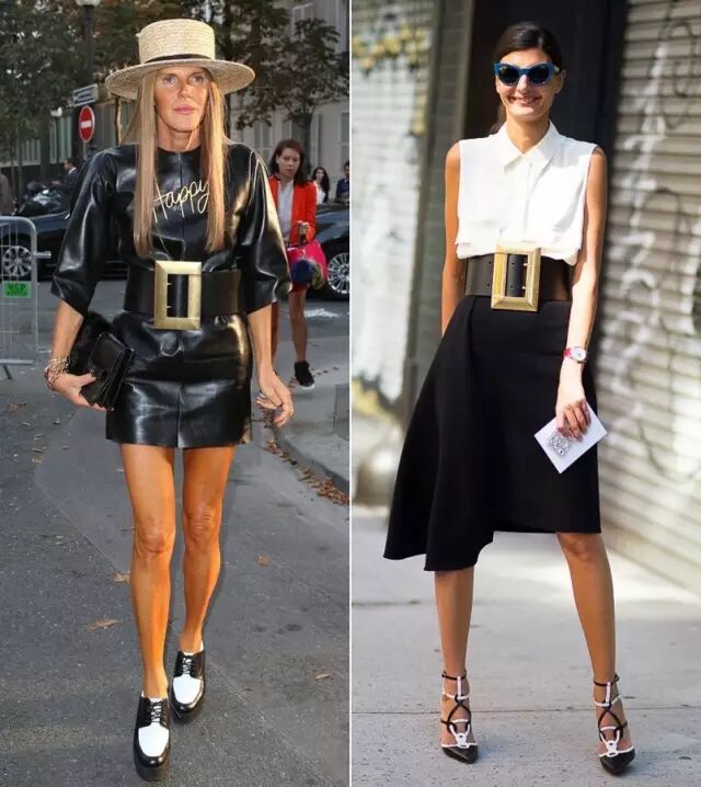 同样一条夸张的腰带,显然是搭右边的白衬衫黑裙子更巧妙。▼