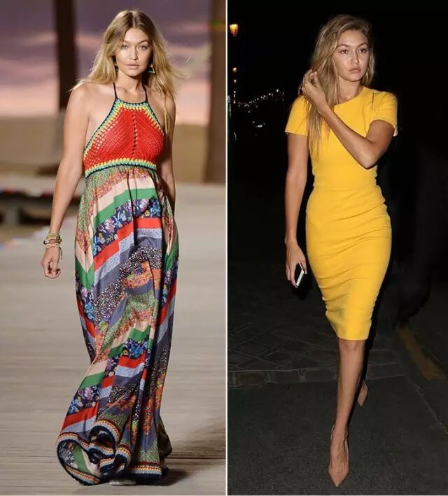 感受一下,超模身材的Gigi 穿紧身裙,要比穿宽松长裙有魅力一万倍。▼