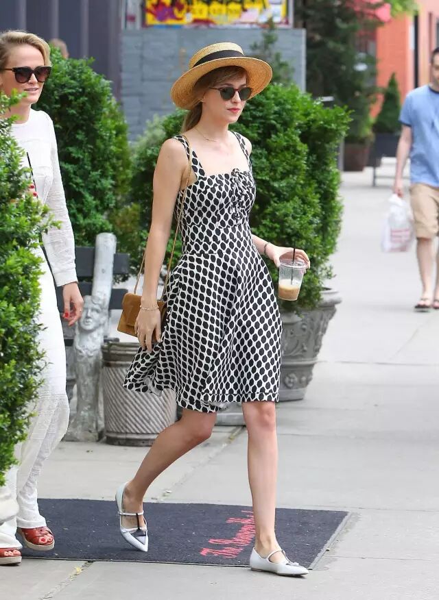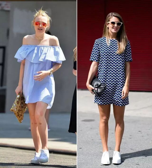 吊带或抹胸式的宽松H型裙也要慎选,尤其是大胸姑娘。Kate bosworth和达妹穿都不如她们穿其他裙子那么好看。▼