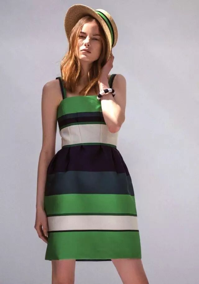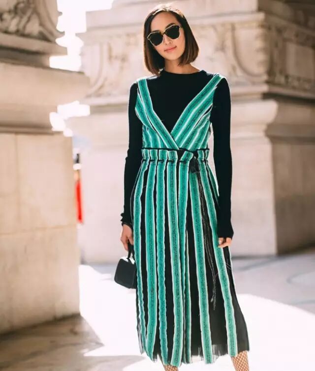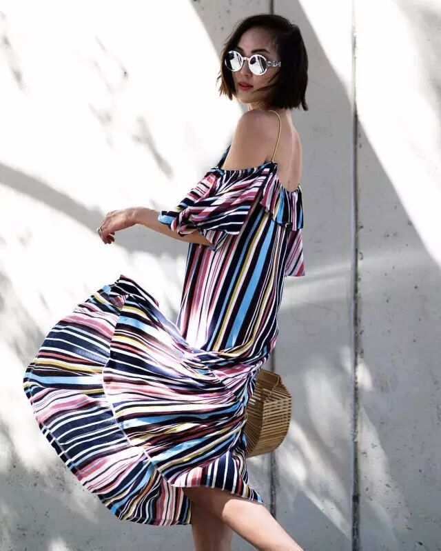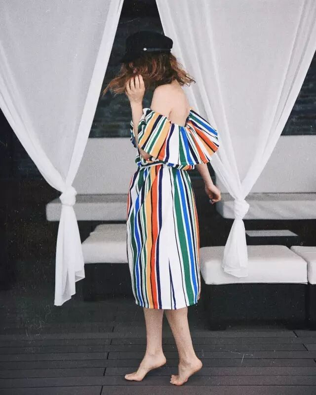 买彩条纹连衣裙时,最好是选择能多露肌肤的款式,露肩和吊带款都可以大胆地选。还可以选无袖的吊带款或大V领。因为彩条纹元素本身的存在感已经很强了,多露些肌肤看起来会更清爽更舒服。▼
