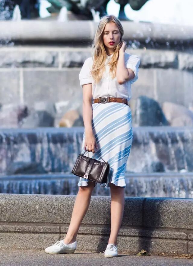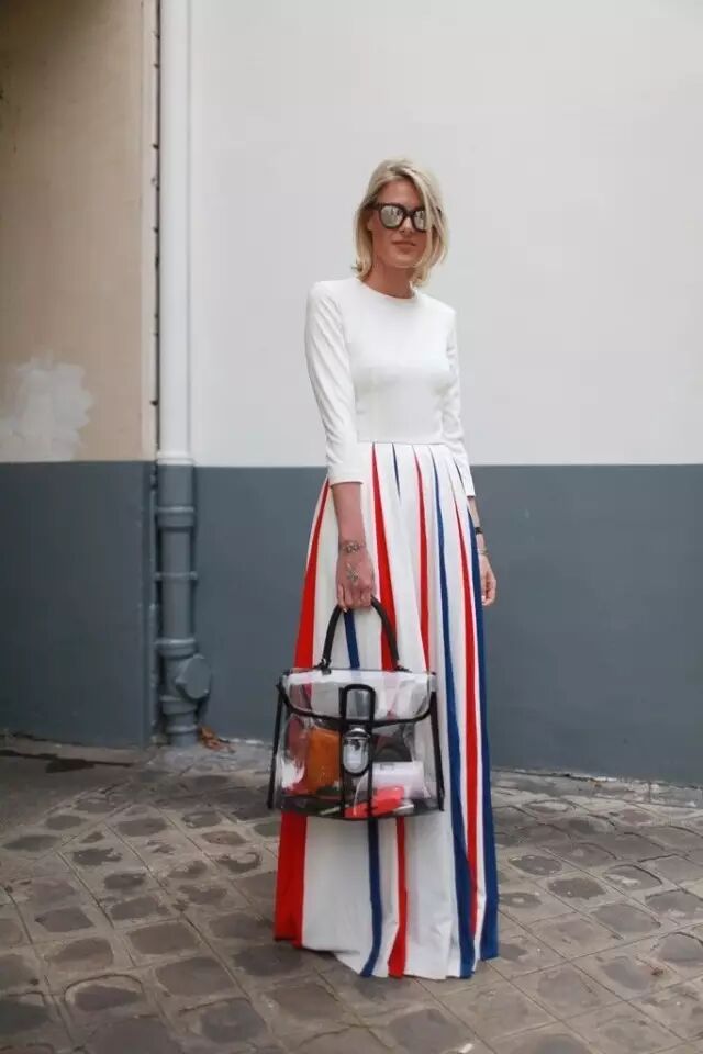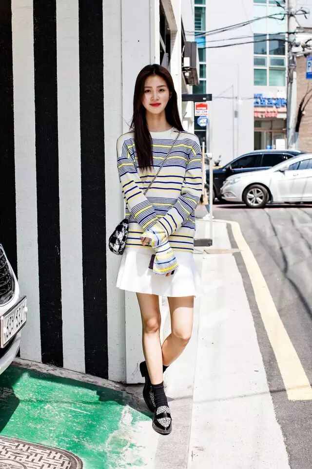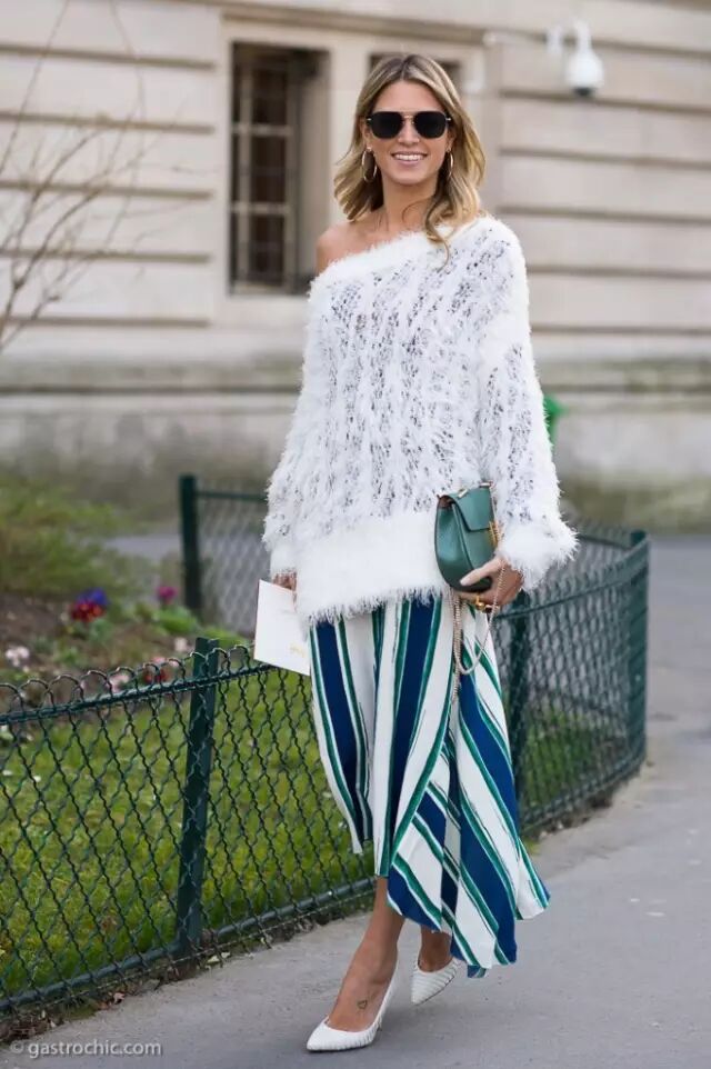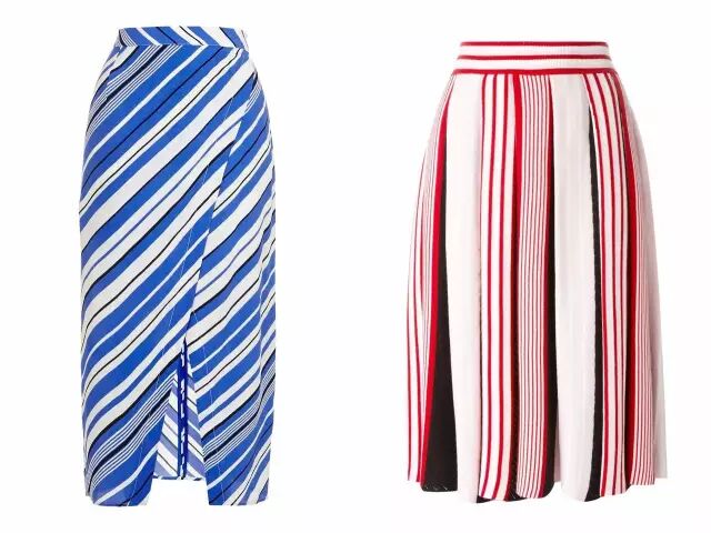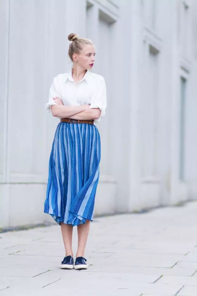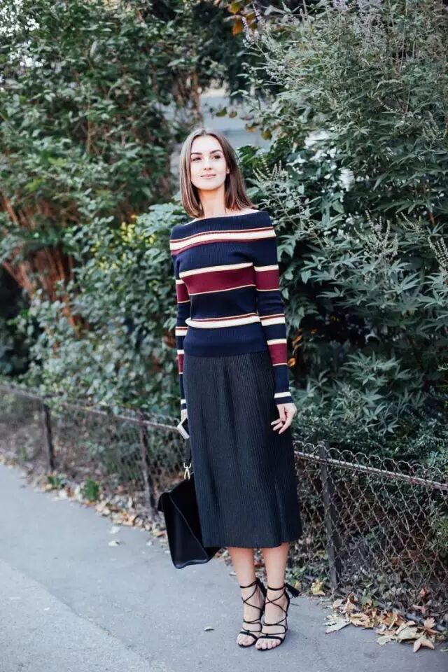 蓝白条纹裙子这两年最流行,很有文艺气质。在其中再加入了一些灰色的彩条纹裙会更特别一点。看图就知道,这种裙子和白上衣是绝配。▼