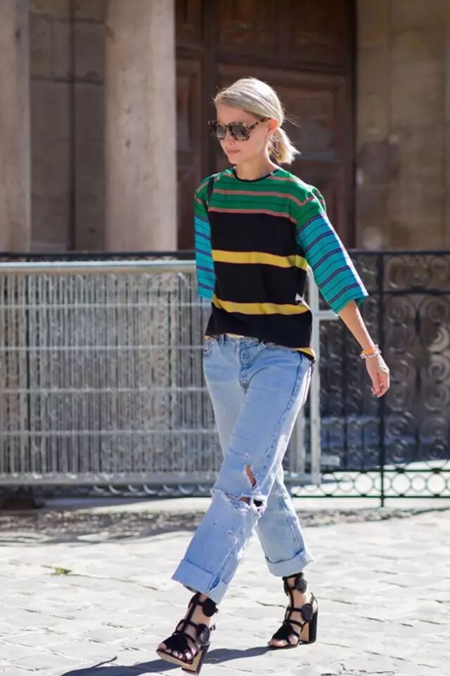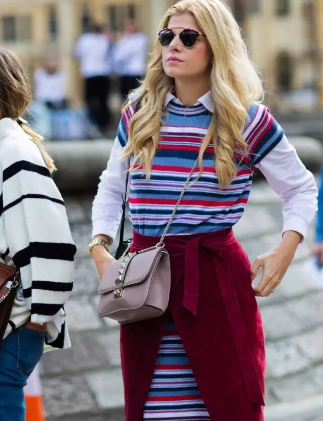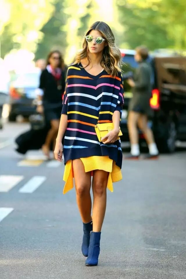 虽说彩条纹好看,但无论哪个单品,配色还是很重要的。我不太喜欢看条纹数量特别多而且每一种颜色都特别鲜艳的,容易看得眼睛很忙。比如今年流行的彩虹条纹,并不觉得好看。▼