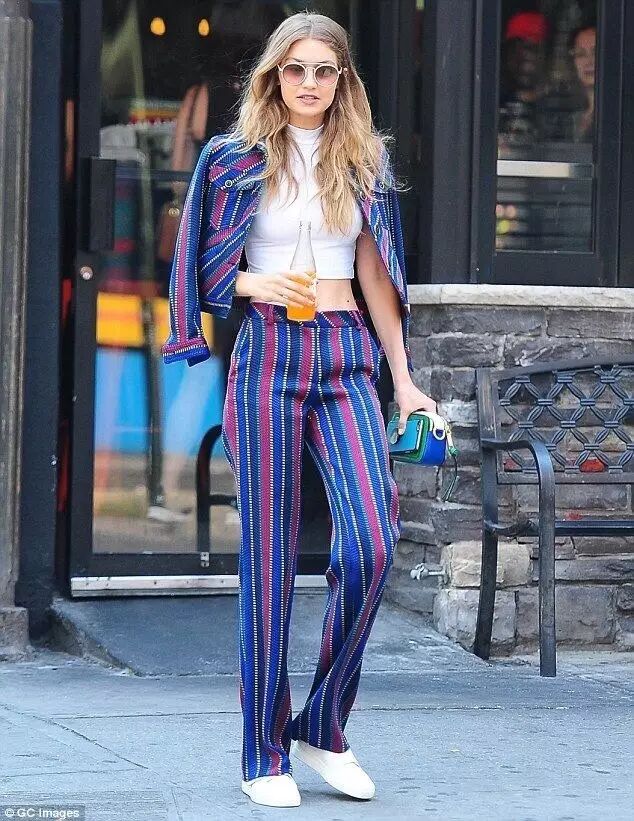 Gigi前些天的街拍穿了一身彩条纹的西装。▼