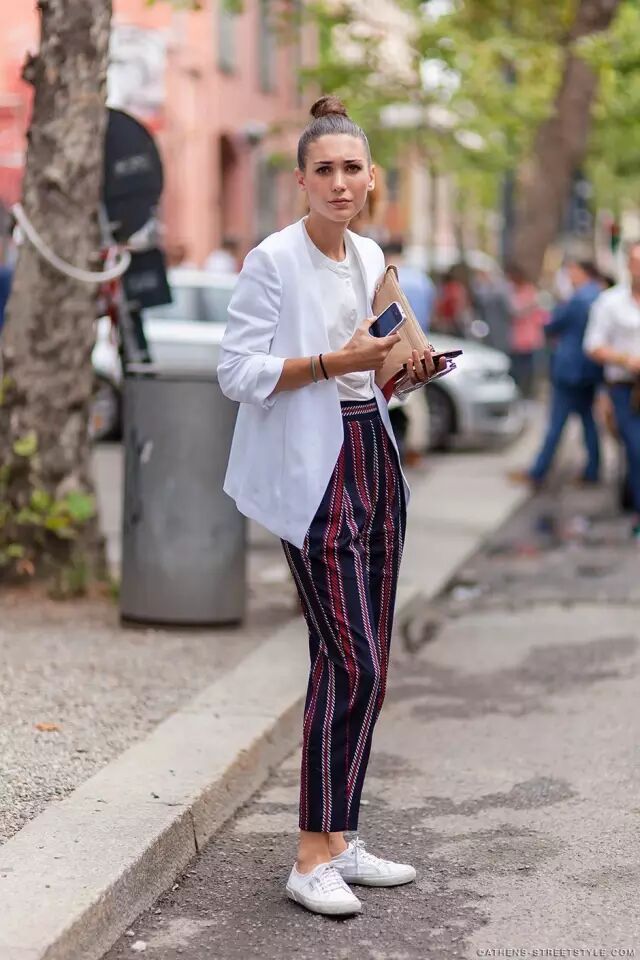 彩条纹裤子搭配白色鞋子都挺好看的,穿去上班首选白色尖头高跟鞋。▼