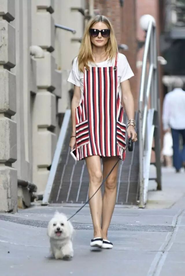 Olivia最近街拍中就穿过一件彩条纹背带裙,搭配白T恤,时髦的休闲感。▼