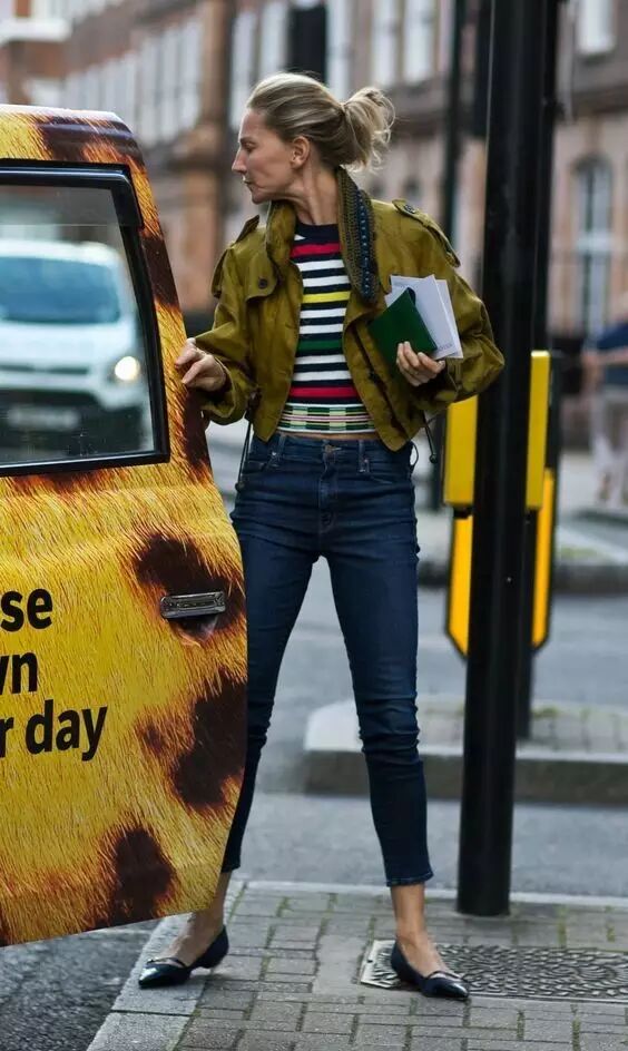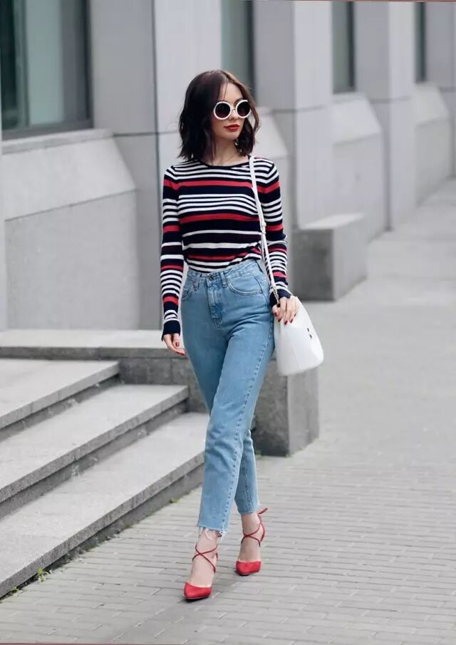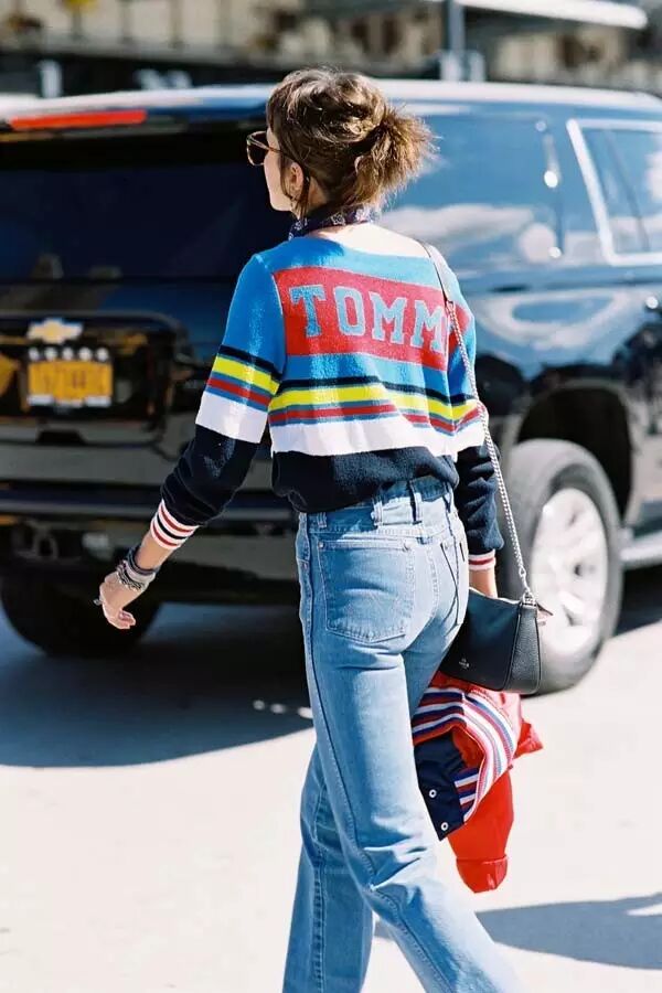 彩条纹上衣买来根本不用担心不会搭。因为,无论是什么配色的条纹,随便搭一条蓝色牛仔裤都是好看的。▼