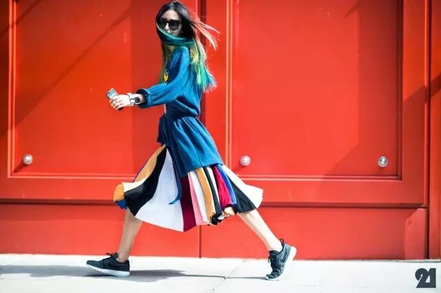 彩条纹本身就是充满活力的元素,可以试试用它来搭配出运动风,比如搭配相对宽松的运动裤,走活力少女风。▼