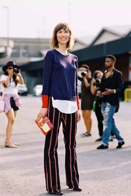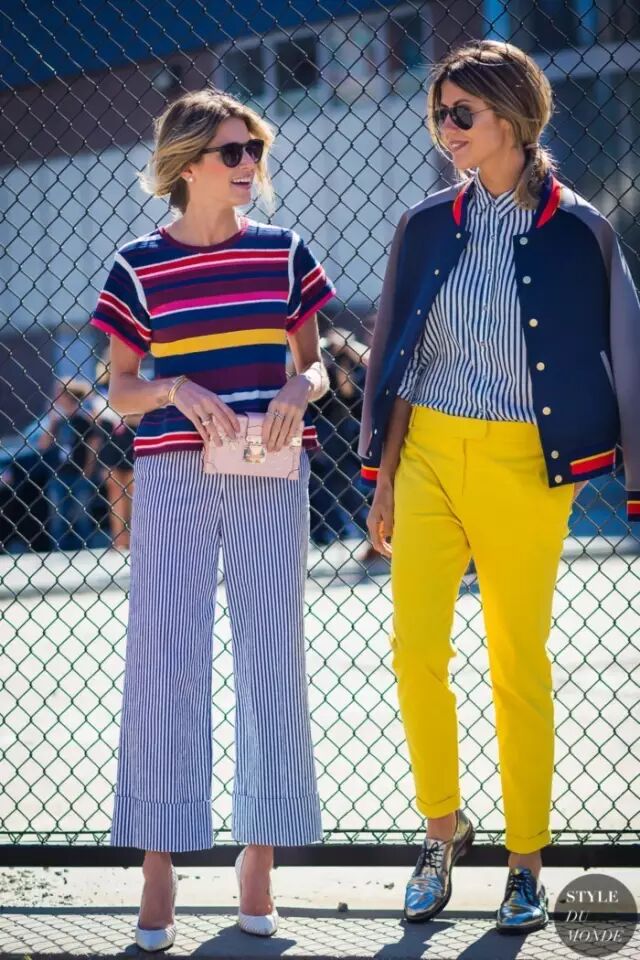 下面这个也是刚刚说的条纹搭条纹。彩色条纹上衣配彩色条纹裤子,特别又不杂乱。想尝试这种搭配的,最好是选风格一致的条纹单品,比如下面这身两件都有点偏复古,这样整体风格才能统一。▼